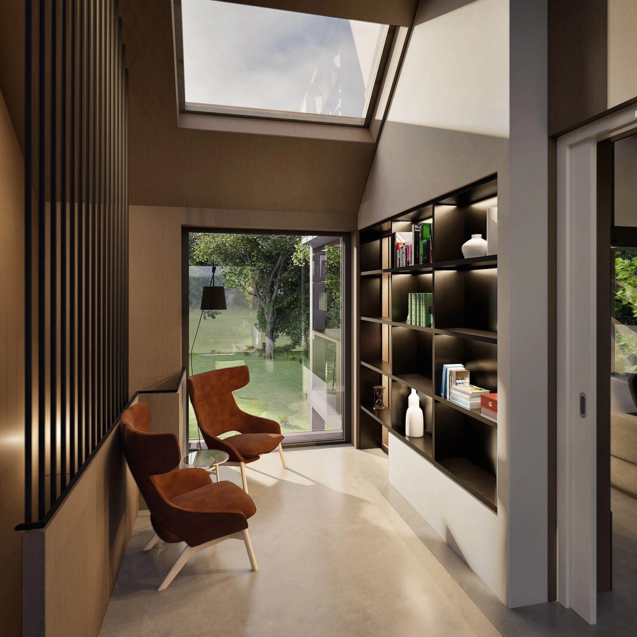 Ascending the feature staircase, you arrive at a spacious library area with open seating. This space is designed with bespoke shelving for books and art pieces, making it a perfect space for contemplation, or a spill over area for party guests. A glass balustrade overlooks the double-height entrance hall below, offering a sense of continuity throughout the levels of the home. A rooflight above and large window allow natural light to flood the space, whilst offering views over the front and rear of the property.